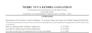 Last date for Receipt of Examination Fee On-line in the Bank: 31.12.2018 Nehru Yuva